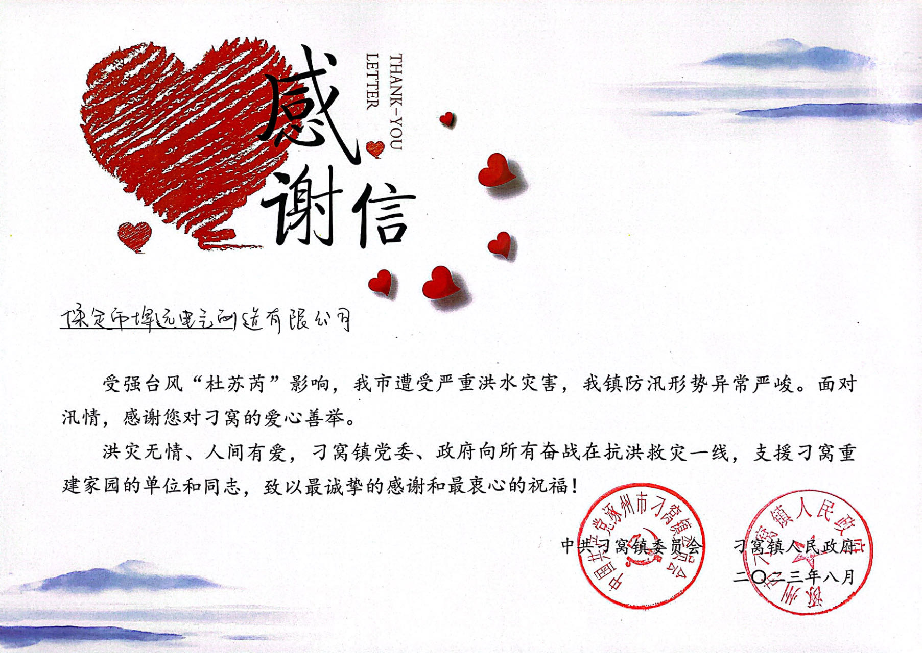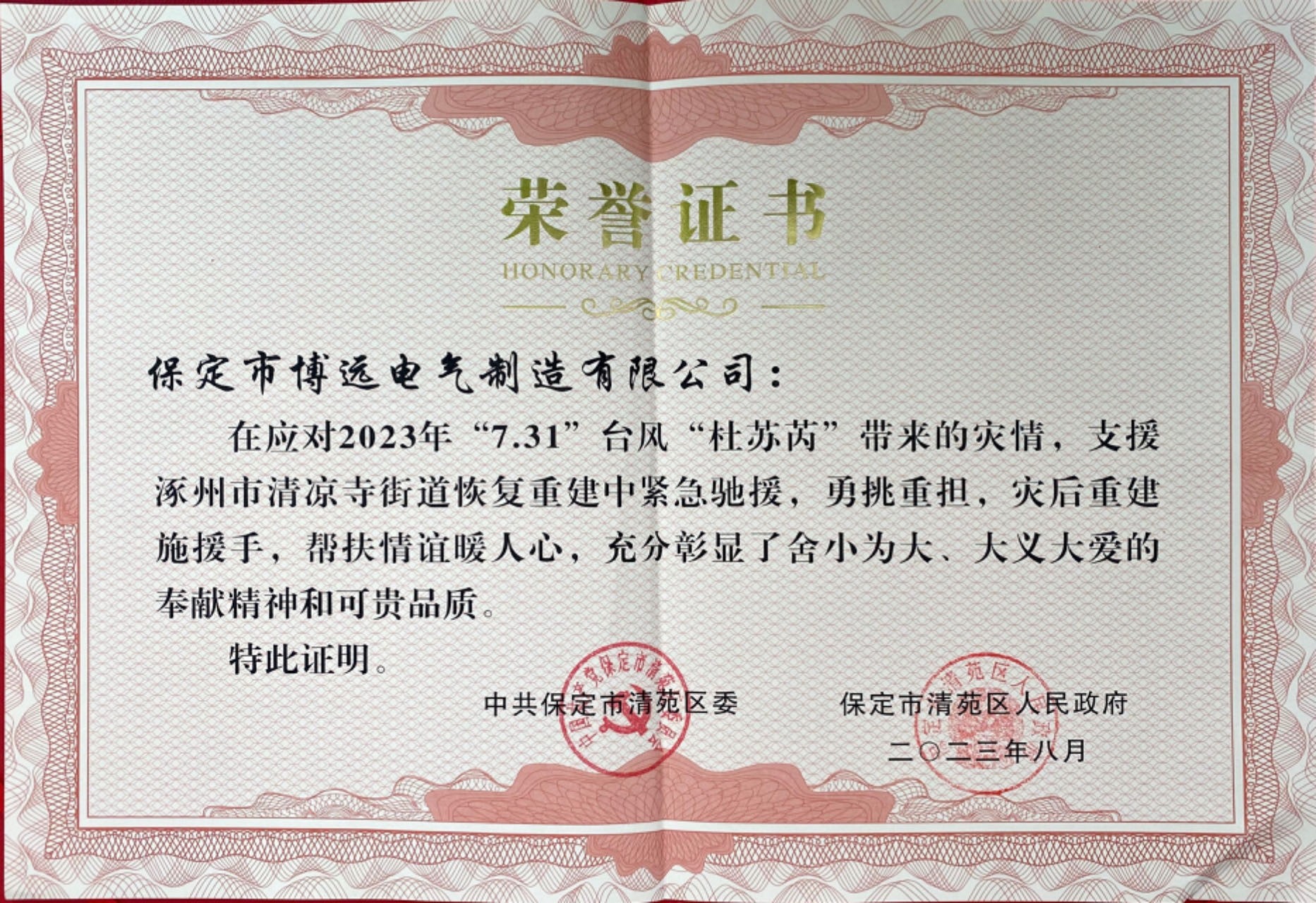 今年 7 月受臺風杜蘇芮影響,涿州地區(qū)受災嚴重。博遠電氣積極響應市委、市政府號召,在清苑區(qū)委、區(qū)政府的領(lǐng)導下,全力參與抗洪救災及災后重建任務(wù),保障涿州市人民基本生活。我公司放下訂單、暫緩在建項目,秉承著電力先行的大方向,調(diào)集所有精干力量 260 余人援助涿州災后電力恢復工作,緊急調(diào)配公司庫房與合作商現(xiàn)有電力物資運抵涿州,保障供電線路恢復、居民生活用電、居民小區(qū)動力用電、黨政機關(guān)、學校用電、企事業(yè)單位用電等搶修工作。